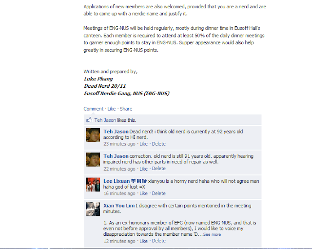 If my memory did not fail me, somehow the conversation ranged from being a nerd to how people label our clique as. For your information, the clique that i mix with in my hall used to be called the "Eusoff Freshie Gang" because well, we stay in Eusoff Hall and we happen to be freshmen. The only problem was the "Freshie" tag because we can't stay fresh forever and sooner or later we gonna have to change names. We just don't have the time, until today that is. After a hearty bowl of noodles, a cup of bubble tea and a fair amount of cock-talking, somehow the neurons in my brain decided to fire more rapidly and eventually lead to the below events:-