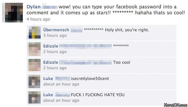 Did you know that typing your password into Facebook, no matter where, like comment box or wall, something magical will happen? Apparently, Facebook has some sort of programming that will detect whenever your password is entered into public spaces such as walls or comment box and automatically converts it into asterisks to prevent any leaks of confidential information. Like *****. Check out the following picture below!