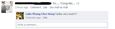 Just when i thought life couldn't get any better, i was greeted this morning with a rather peculiar wall post in Facebook with the message "Yo.... Congrats... =)"