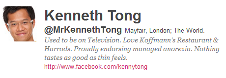 This is precisely what happened to this Mr Kenneth Tong who first tweeted about how being size zero is the epitome of beauty and advocates "managed" anorexia in his tweets. Not only that, he goes further to discriminate those who are not thin, or curvaceous, by saying that fat is a sin, thin is everything and the only way to achieve it is to go size zero and be an anorexic.